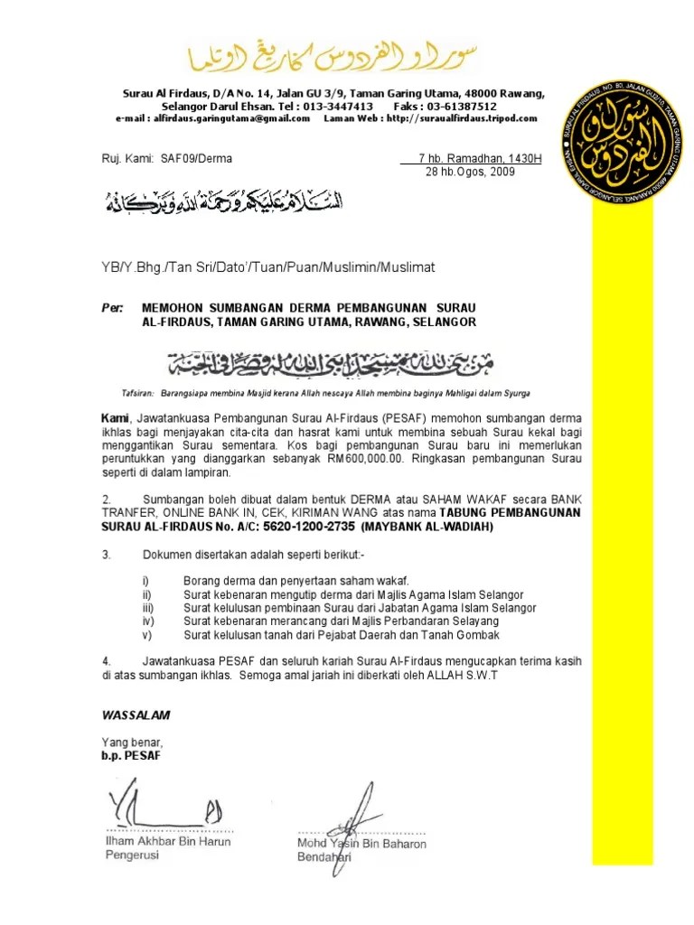 Bantuan kewangan dan yuran pengajian bacaan lanjut. Sebarang bentuk sumbangan khususnya wang ringgit amat kami harapkan. Exco kerajaan negeri lawat unipsas, terjejas banjir | 23/12/2021 kuantan. Pemangku raja pahang serah surat pelantikan naib canselor | 28/09/2021 kuantan. Atas perhatiannya kami ucapkan terima … Gema maulidur rasul 2021 | 21/10/2021. Apr 13, 2022 · bantuan tambahan dalam menyediakan bantuan kewangan melalui zakat dan dana kebajikan, peranti pembelajaran, serta makanan dan keperluan peribadi juga akan diteruskan," katanya. Contoh surat kenaikan gaji kepada pekerja have a graphic associated with the other.contoh surat kenaikan gaji kepada pekerja it also will feature a picture of a kind that might be seen in the gallery of contoh surat kenaikan gaji kepada pekerja. 37 tahun 2004 tentang kepailitan dan penundaan kewajiban pembayaran utang (uu kepailitan), kepailitan adalah: Transfer uang sumbangan bisa dikirim ke bank bri no. Berikut ini contoh surat permohonan bantuan dana untuk pembangunan masjid yang ditujukan kepada donatur, baik perorangan maupun kelompok. Apr 27, 2022 · menurut dia, dandim 1701/jayapura letkol inf richard sangari juga telah memerintahkan danramil jayapura utara untuk mengembalikan seluruh bantuan yang telah diterima. Kasus dugaan korupsi soeharto menyangkut penggunaan uang negara oleh 7 yayasan yang diketuainya, yaitu yayasan dana sejahtera mandiri, yayasan supersemar, yayasan dharma bhakti sosial (dharmais), yayasan dana abadi karya bhakti (dakab), yayasan amal bhakti muslim pancasila, yayasan dana gotong royong kemanusiaan, yayasan trikora. Rekening 027412345678 a.n smu bina harapan.